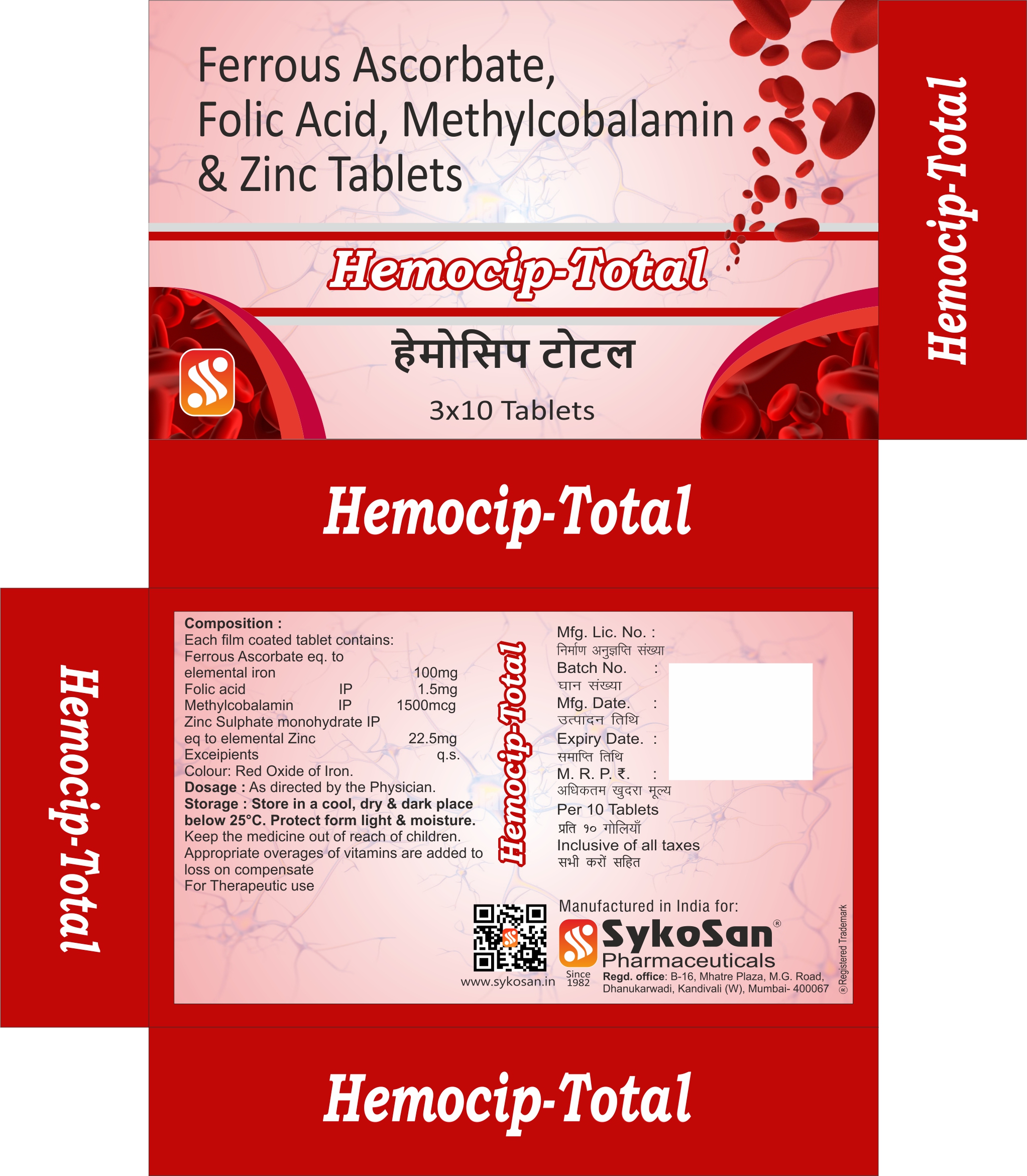Hemocip Total Tablet is a nutritional and dietary supplement that contains iron, zinc, and vitamin B12 as active ingredients. It is a potent combination of minerals and vitamins that is commonly used for the management of vitamin B deficiency and nutritional deficiencies. The tablet is primarily prescribed to address iron and folic acid deficiency.
